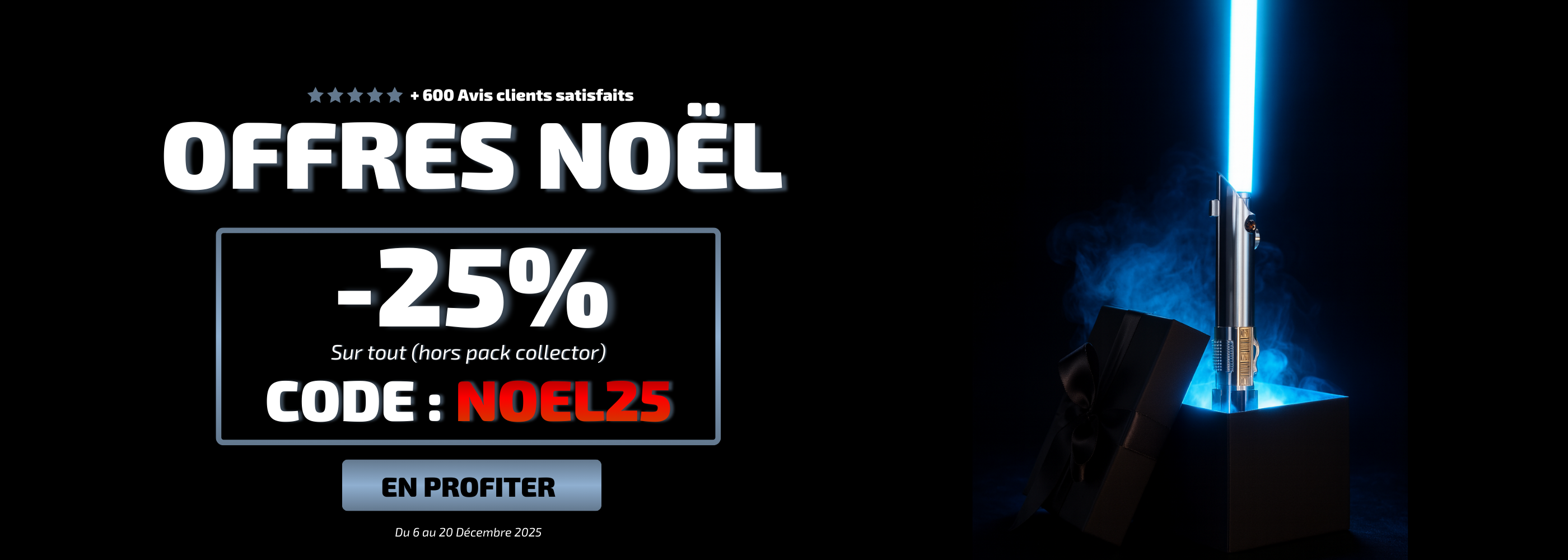Bienvenue chez le-sabre-laser.fr, la boutique de choix pour les apprentis Jedi et Sith depuis 2021. Notre mission est de forger non seulement des sabres laser de la plus haute qualité mais aussi de tisser des liens forts avec la communauté de fans de Star Wars. Depuis notre création, nous avons collaboré avec des ambassadeurs de la galaxie Star Wars tels que StarWars AT-AT, Sidemaul, LeLore Trashcinéma ou encore math se fait des films afin de vous offrir des produits testés et approuvés par des connaisseurs. Ces collaborations nous ont permis de peaufiner nos conceptions et d'assurer que chaque sabre répond non seulement aux attentes de nos clients mais aussi à l'enthousiasmeet à l'expertise de ceux qui vivent et respirent Star Wars. Chez le-sabre-laser.fr, nous sommes plus qu'un magasin : nous sommes une partie intégrante d'une communauté qui célèbre l'héritage et l'innovation de cette saga intemporelle.
