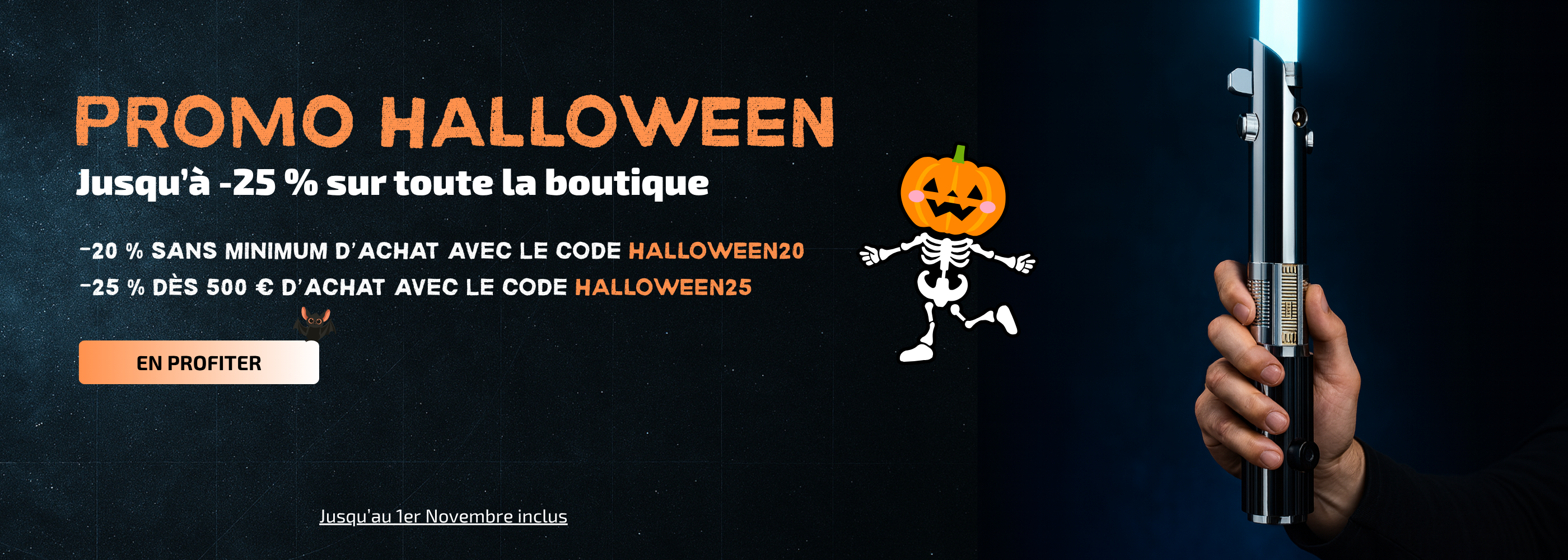 Chez nous, tu trouveras les plus belles répliques des sabres laser de Star Wars, pour marcher dans les pas de tes héros favoris : Obi-Wan Kenobi, Rey Skywalker,Luke Skywalker ou encore Anakin Skywalker. Attiré par le côté obscur de la Force ? Plus habiles que le célèbre ferrailleur Watto de la saga, nous te proposons les sabres laser de Darth Vador, du Comte Dooku ou de Kylo Ren, sans que tu aies besoin de voyager dans une galaxie lointaine. Et oui, nous offrons même un service de livraison qui parcourt tous les systèmes solaires jusqu'à ta porte !