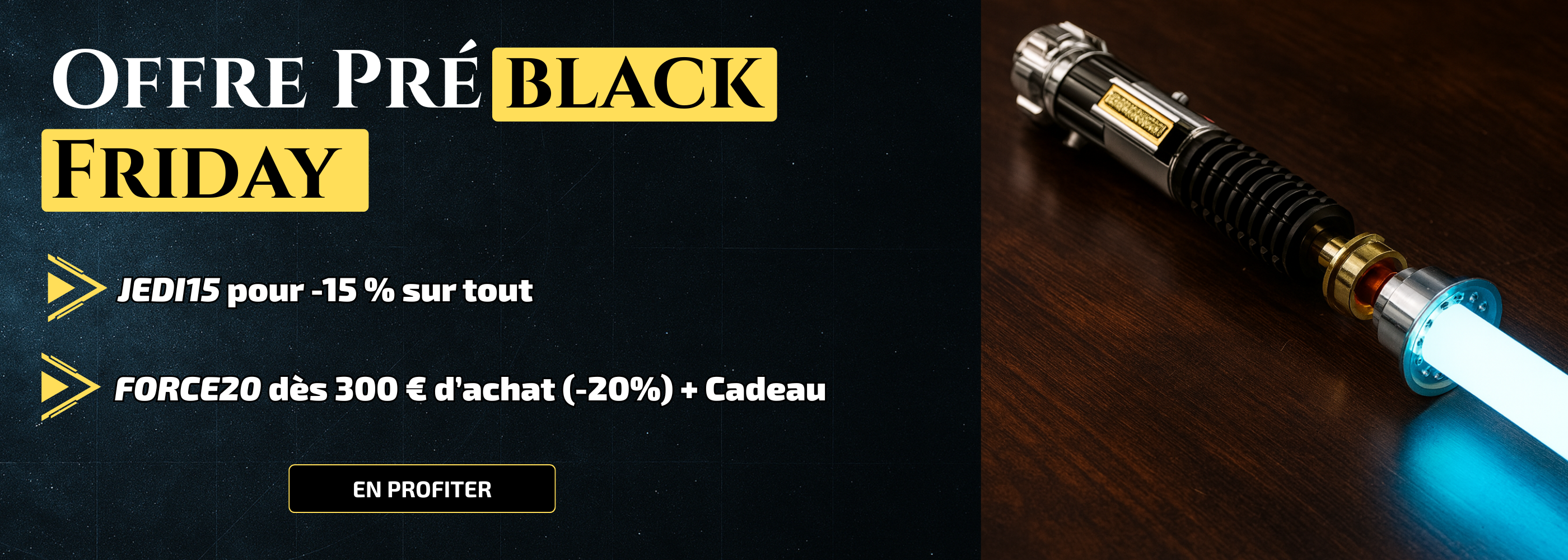 Chez nous, tu trouveras les plus belles répliques des sabres laser de Star Wars, pour marcher dans les pas de tes héros favoris : Obi-Wan Kenobi, Rey Skywalker,Luke Skywalker ou encore Anakin Skywalker. Attiré par le côté obscur de la Force ? Plus habiles que le célèbre ferrailleur Watto de la saga, nous te proposons les sabres laser de Darth Vador, du Comte Dooku ou de Kylo Ren, sans que tu aies besoin de voyager dans une galaxie lointaine. Et oui, nous offrons même un service de livraison qui parcourt tous les systèmes solaires jusqu'à ta porte !
